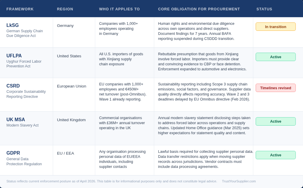 Comparison table of five international supplier compliance regulations: LkSG, UFLPA, CSRD, UK Modern Slavery Act, and GDPR. Shows region, who each applies to, core procurement obligations, and current enforcement status as of April 2026.