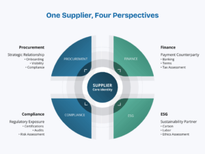 In many organizations, each function manages supplier information independently. Finance has their records in the ERP. Compliance maintains a separate database of certifications. ESG tracks sustainability data in spreadsheets. Procurement manages relationships in their own system.