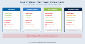 When Finance updates banking details, Compliance doesn't automatically know. When a certification expires in Compliance's records, Procurement isn't alerted. When ESG discovers a supplier has changed their manufacturing processes, Finance is still paying invoices against outdated contract terms.
