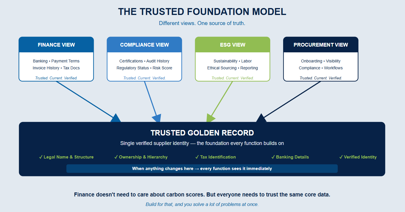 Finance doesn't need to care about carbon footprint scores. Compliance doesn't need to care about payment terms. But everyone needs to trust that the supplier they're looking at is the same supplier everyone else is looking at - verified, current, and accurate.