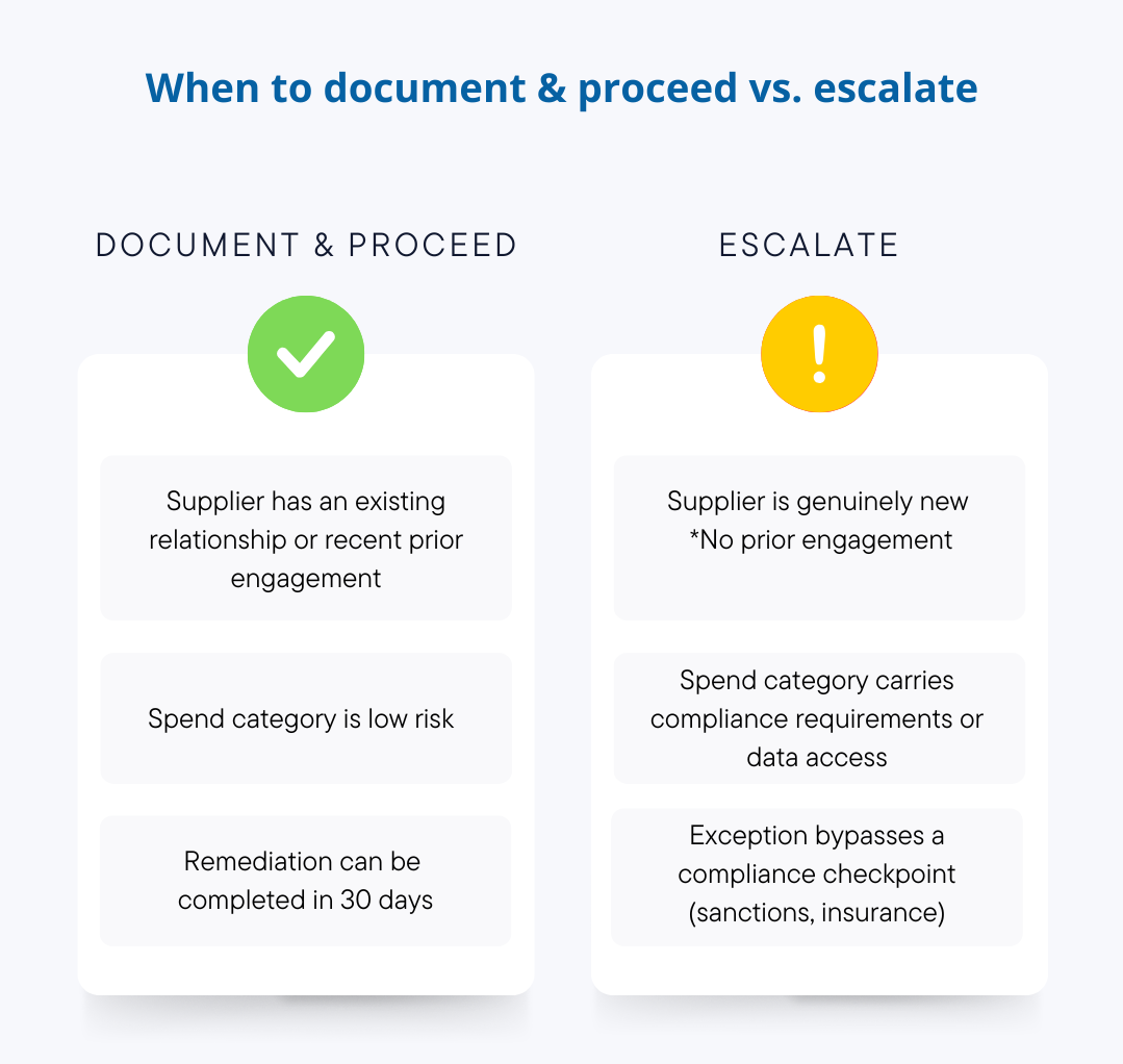 Not every exception is the same. Some are low-risk: a supplier you've worked with before who missed a renewal date. Some are higher-risk: a new vendor in a high-compliance spend category was brought in without any screening.