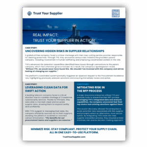 A global utilities customer used TYS to surface connections to a supplier’s parent company tied to human trafficking and unauthorized labor, prompting rapid action to remove the supplier.