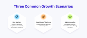 Organizational growth is rarely linear. Drivers of growth may include organic demand, entry into a new market, the launch of a new product line, or a merger or acquisition. While each of these represent strategic wins for the business, they place immediate operational strain on supplier management. As a result, procurement teams must quickly coordinate an expanding supplier network while staying compliant and efficient.